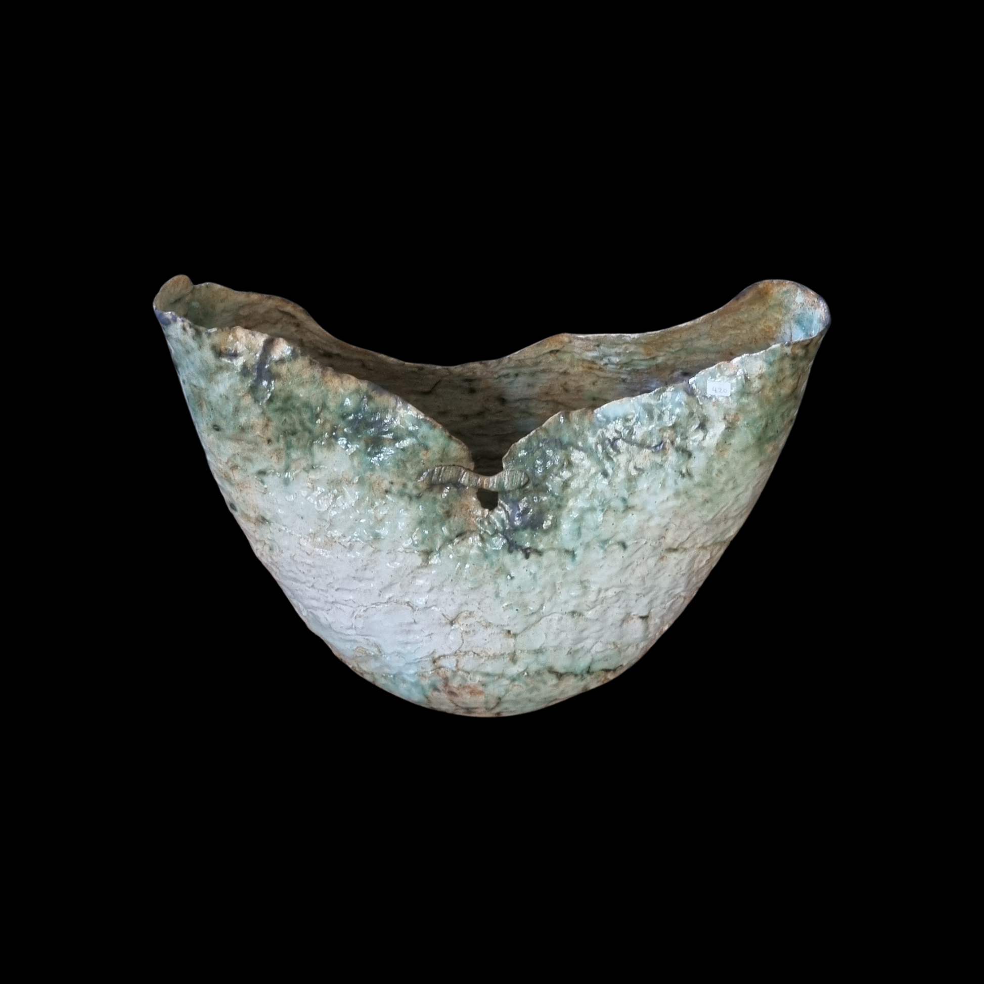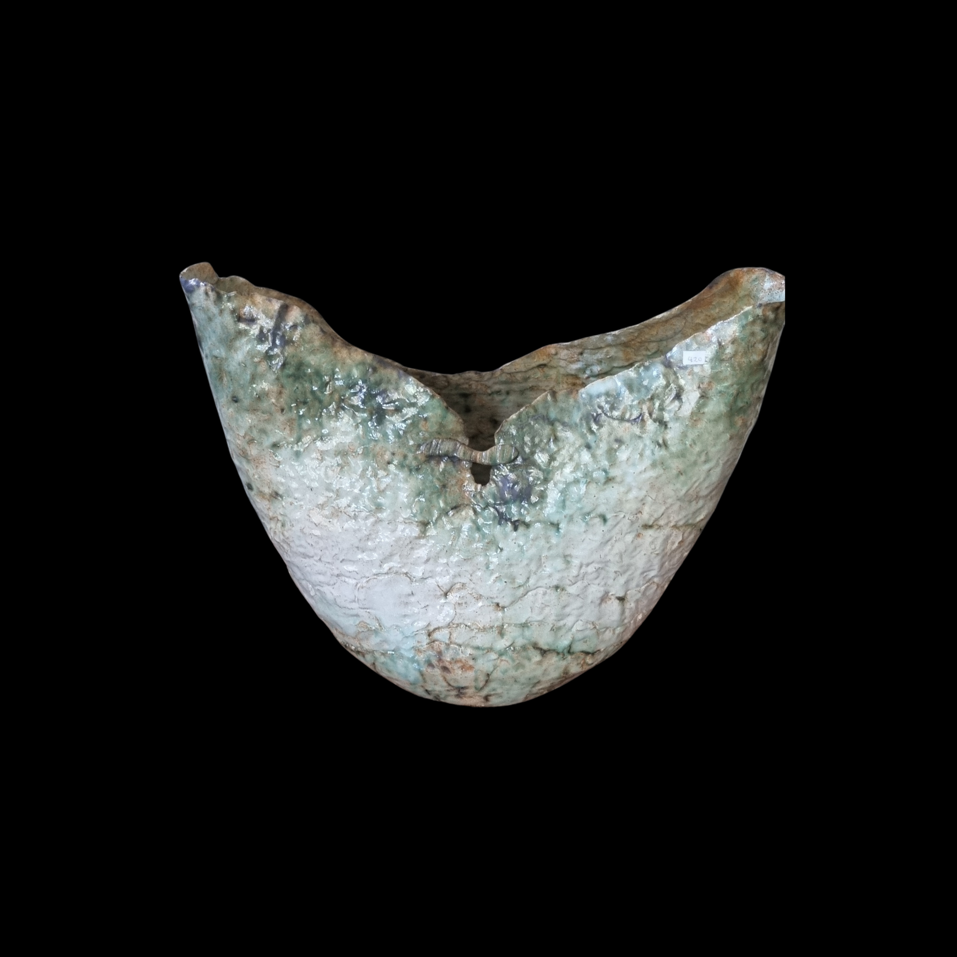 Esta escultura en gres muestra una forma orgánica y texturada, con una superficie que recuerda a minerales erosionados por el paso del tiempo. Sus tonos turquesa y óxidos evocan paisajes naturales y procesos geológicos, invitando a contemplar la belleza imperfecta de la materia transformada por el fuego.