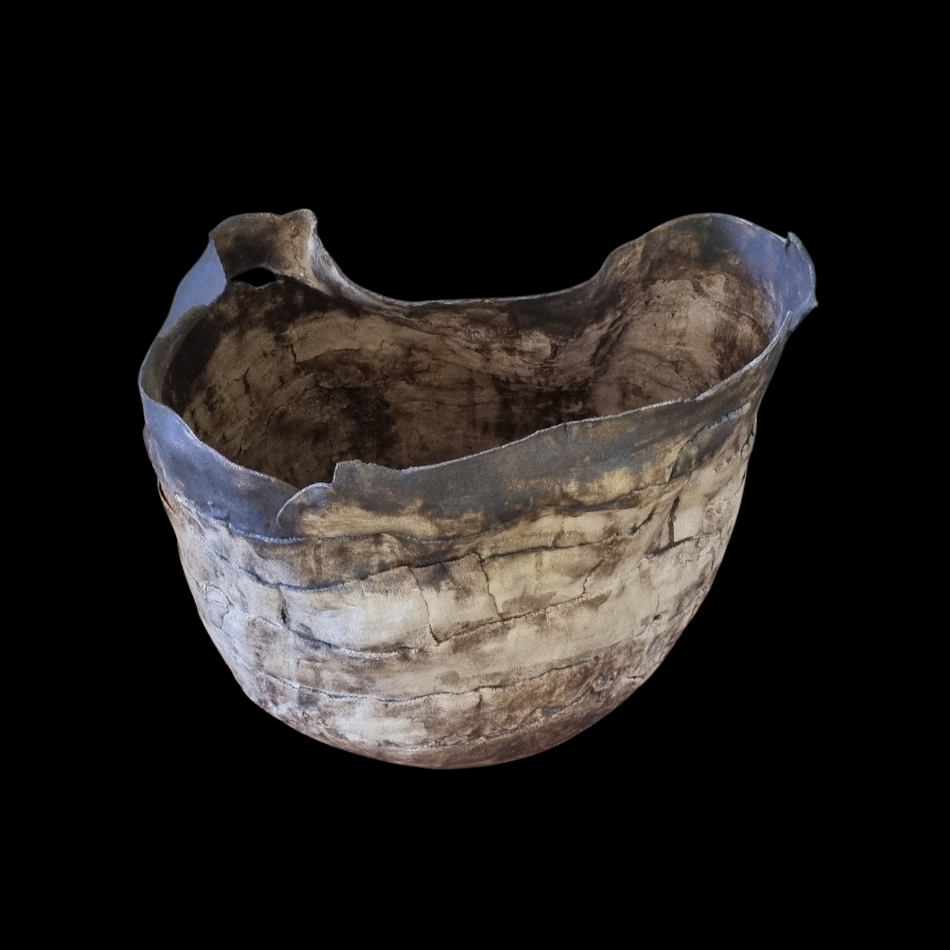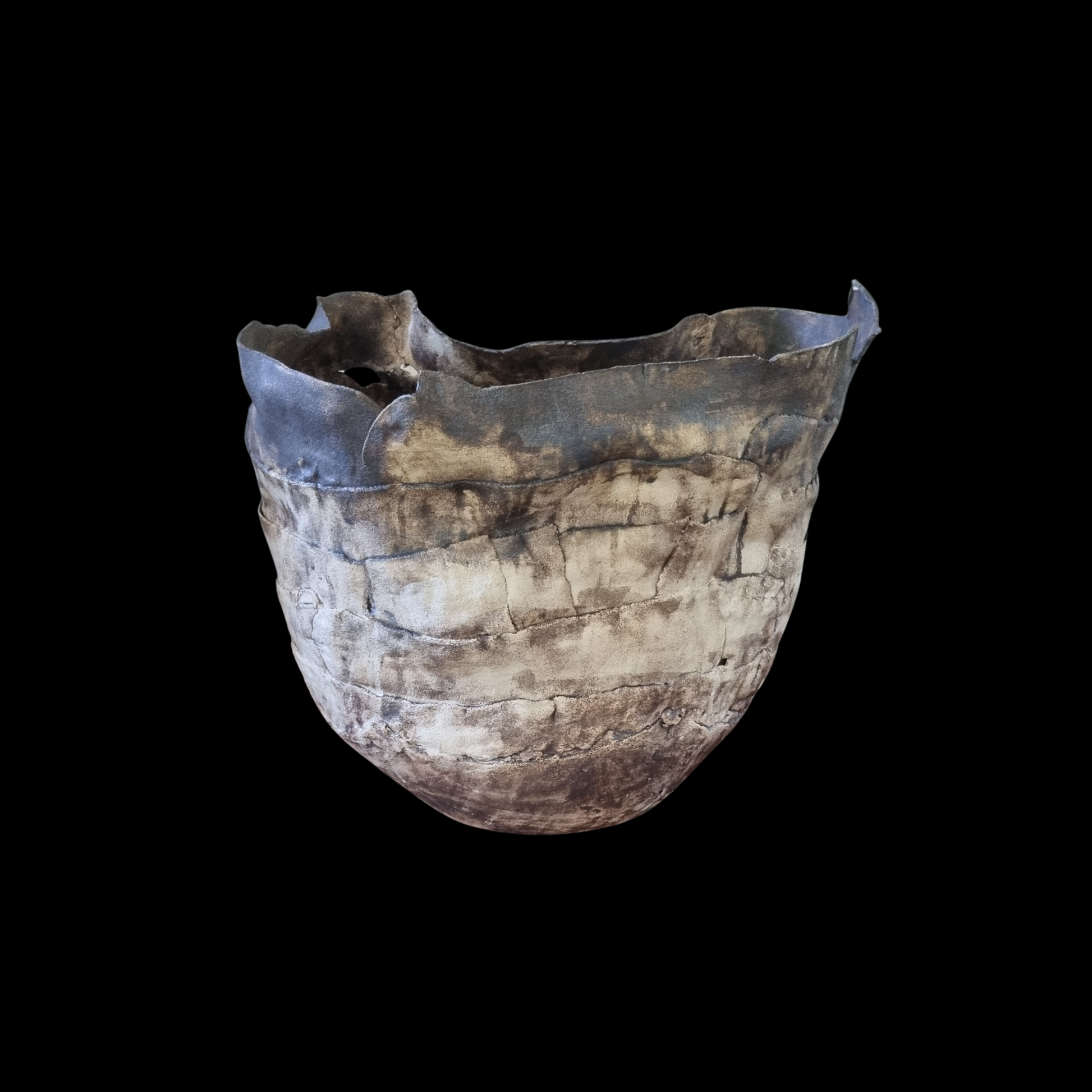 Esta escultura en gres muestra una forma orgánica y texturada, con una superficie que recuerda a minerales erosionados por el paso del tiempo. Sus tonos turquesa y óxidos evocan paisajes naturales y procesos geológicos, invitando a contemplar la belleza imperfecta de la materia transformada por el fuego.