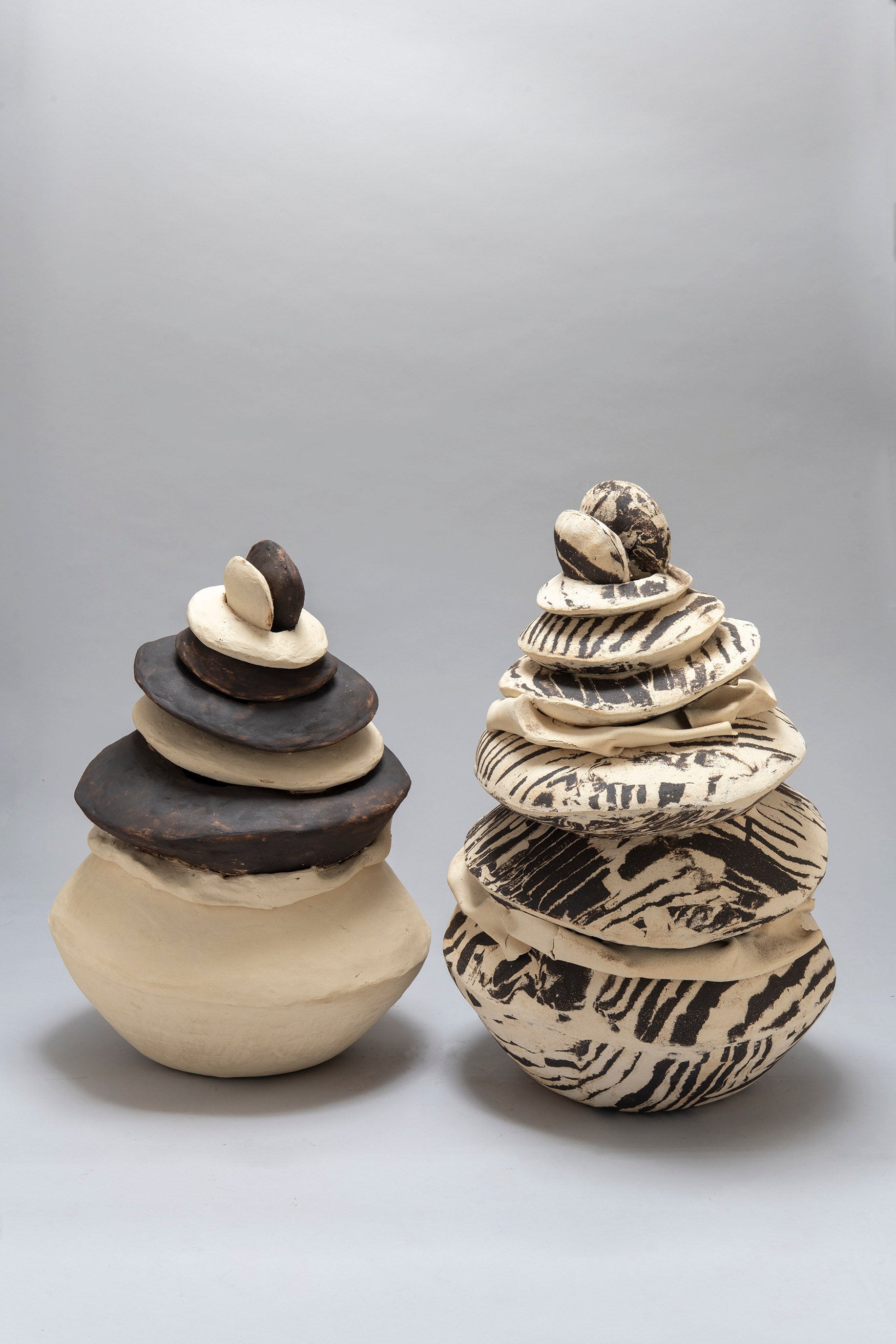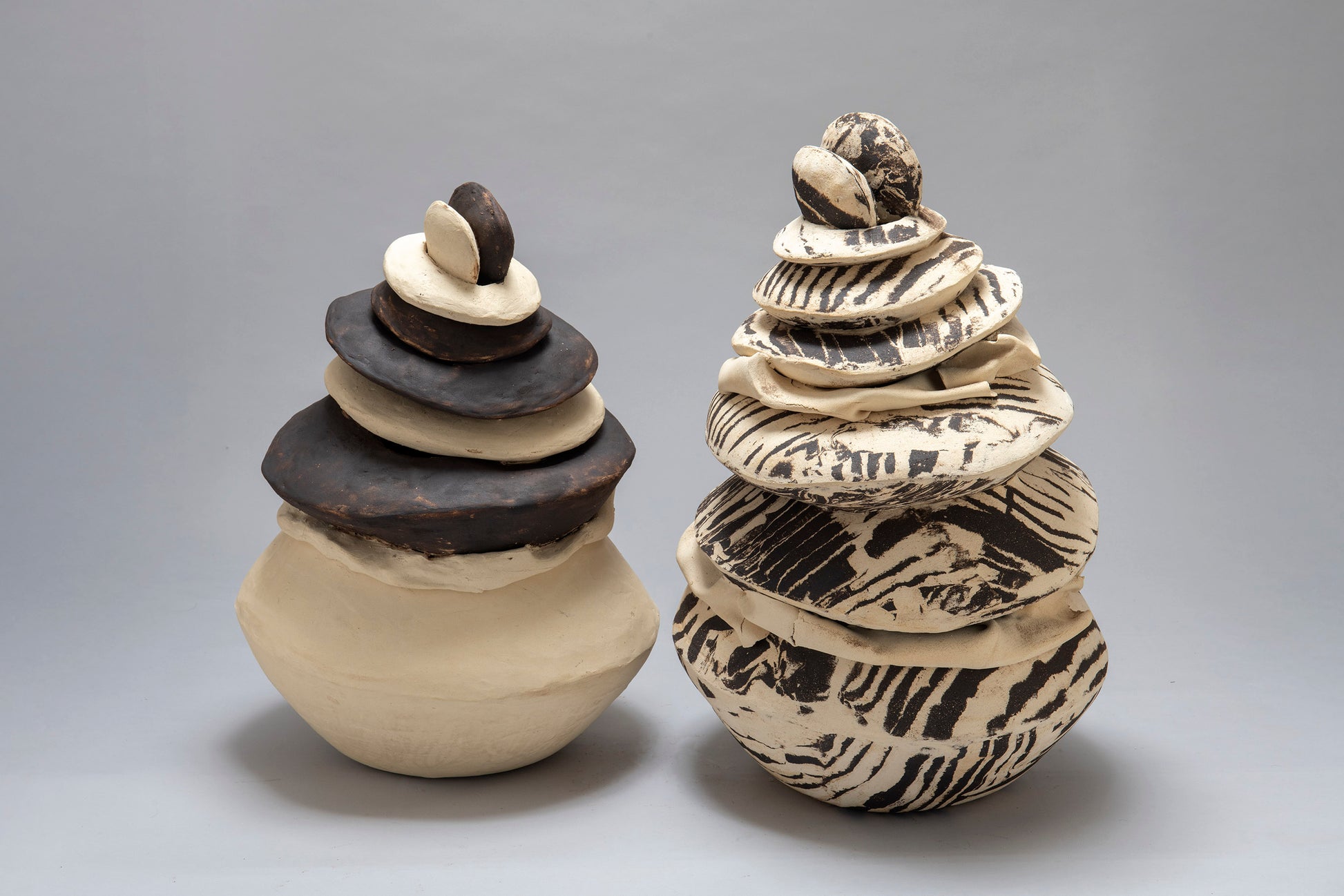 Escultura de cerámica gres esmaltada, compuesta por formas apiladas y colores vibrantes que resaltan su carácter lúdico y escultórico.