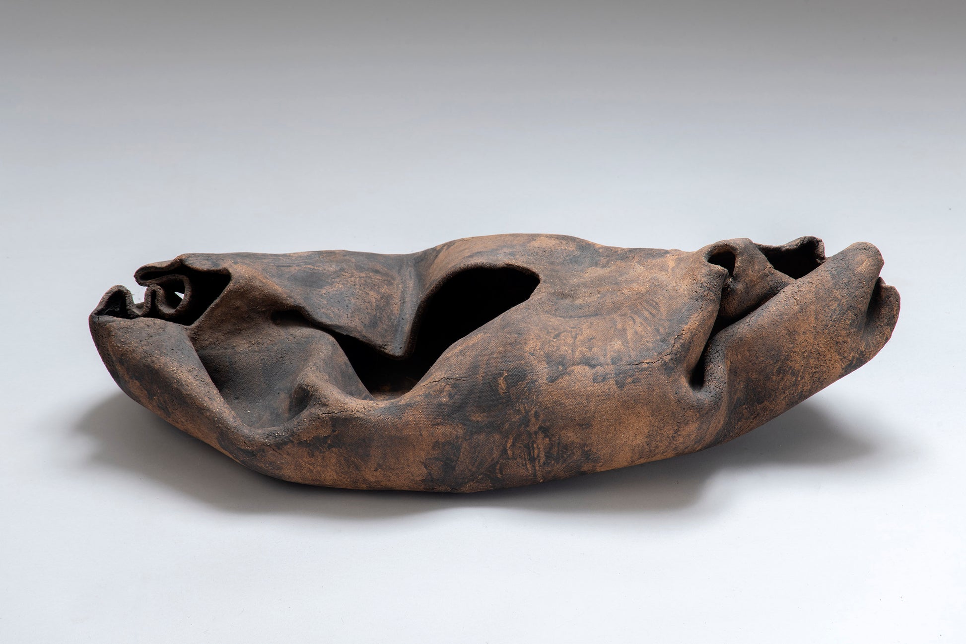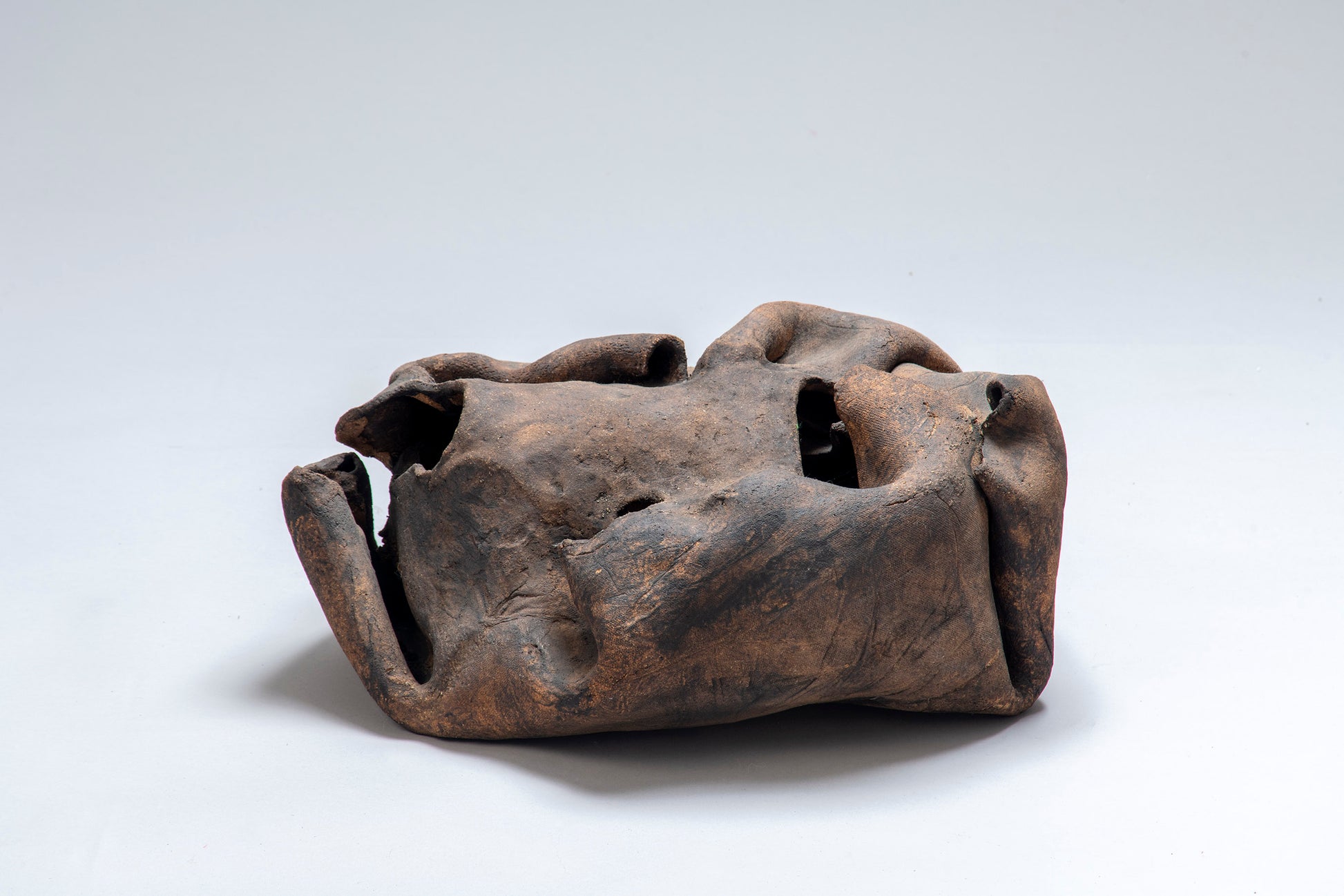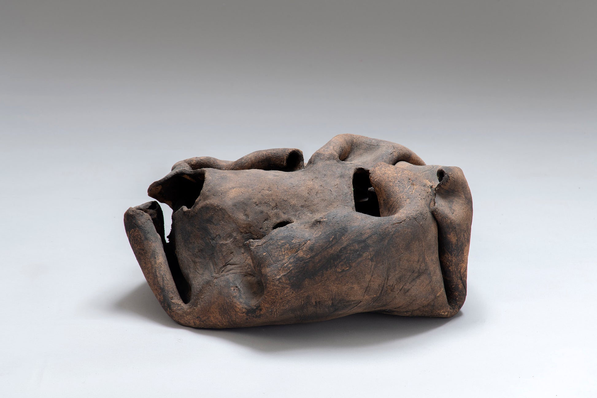 Serie de esculturas en cerámica gres de aspecto terroso, con formas blandas y orgánicas que evocan cuero curtido o textiles arrugados, resaltando textura y gestualidad.
